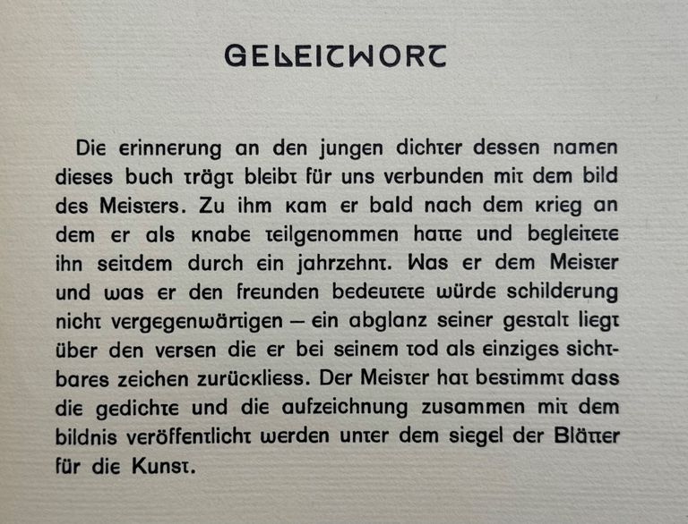 Man sieht ihn selten allein. Die kleinen orte die ihn kennen sind noch voll vom zeitfremden schauspiel wie inmitten der jungen der greise Meister ging. Das volk hat mehr auge als der bürger: es sah die fülle des weissen haares und erriet wieviel die - immer erstrebte nie erreichte - eintracht von jugend und alter bedeute. Man wird später die stillen strassen aufsuchen wo mit der morgensonne sich sein fenster öffnete · wo manchmal schon einer der jüngsten wartete · indessen rings die bürger schliefen. Und zahllose wege im weiten vaterland und ruhmlose orte werden nur gelten weil ER dort ging mit seinen drei · mit seinen sieben · mit seinen zehn getreuen. (...)