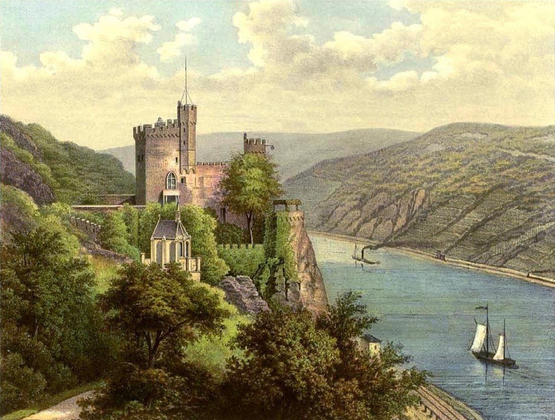 Inbegriff der „Rheinromantik”: Burg Rheinstein hatte einen grossen anteil am erfolg dieses frühen tourismus-projekts. Darstellung von 1880 aus der zeit des Prinzen Georg.